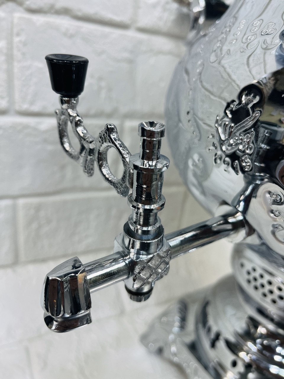 دسته سماور از جنس باکالیت انتخاب شده به این دلیل که تا در صورت داغ بودن، مانع از سوختن دست شما شود.